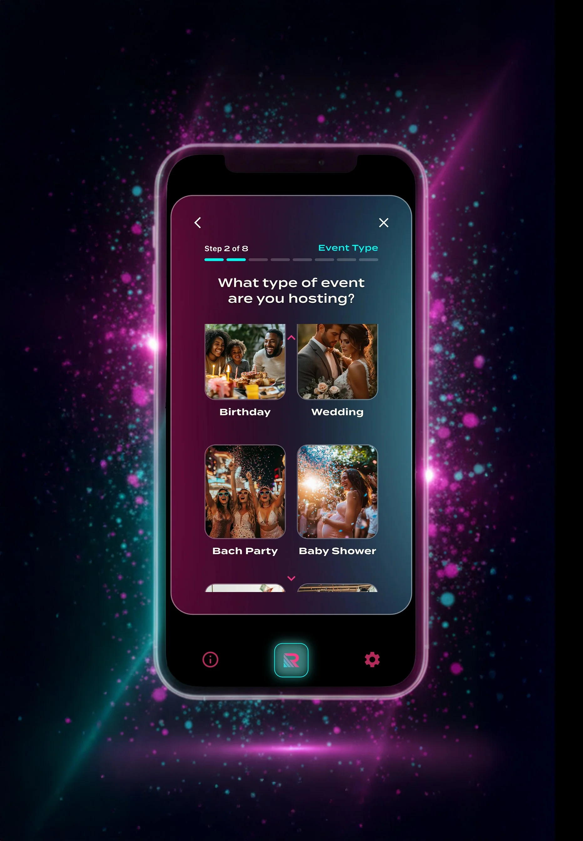 Open the app, tap “Create New Event,” give it a name, and choose how many guests will join. The price automatically adjusts based on the number of guests, and you’ll instantly get a link or QR code to share.
